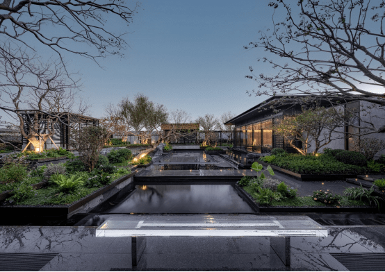 又比如,项目延续了张园“引水入园”的理念,将长200m近1000m²的水系覆盖到整个社区内。水景形态各异,有中心静水、三层跌水、点状涌泉、立面叠瀑、弧形流水五大不同呈现方式。水系的引入,让整个社区彻底灵动飘逸了起来。