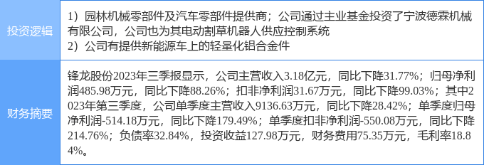 证券之星消息,锋龙股份涨停收盘,收盘价17.03元。该股于9点25分涨停,1次打开涨停,截止收盘封单资金为8520.61万元,占其流通市值2.77%。