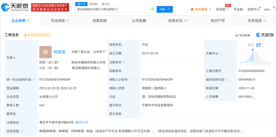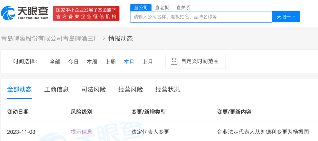 据天眼查App显示,近日,青岛啤酒股份有限公司青岛啤酒三厂发生工商变更,负责人由刘德利变更为杨振国。