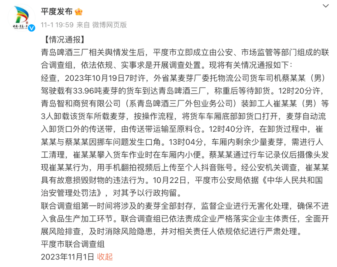 11月1日晚,平度市联合调查组发布情况通报称,系外包业务公司装卸工人崔某某在运送原料的货车车厢内小便,公安机关已对崔某某行政拘留。
