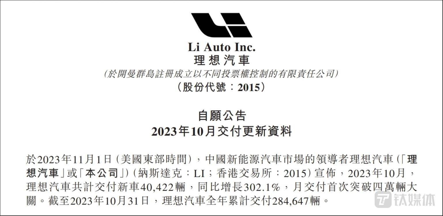 具体来看,今年10月份,共计交付新车40422辆,同比增长302.1%,月交付首次突破四万辆大关。年初以来,理想汽车累计交付284647辆,同比增长165.8%。