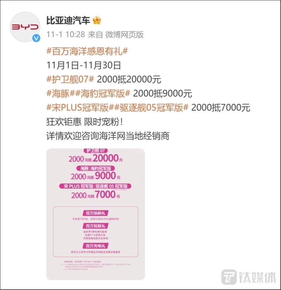 比如,比亚迪股份早前曾对外释放了公司在11月份的优惠政策,具体内容包括:11月1日至30日开展优惠活动,护卫舰07“2000抵20000元”;海豚海豹冠军版“2000抵9000元”;宋PLUS冠军版、驱逐舰05冠军版均为“2000抵7000元”。