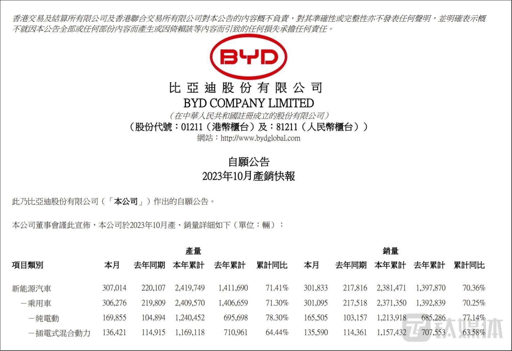 延续了国内新能源车市占率第一的成绩,刚刚过去的10月份,该公司新能源汽车销量为301833辆,较2022年同期的217816辆,同比增长38.57%;年初至今,公司新能源汽车销量累计达1397870辆,同比增长70.36%。