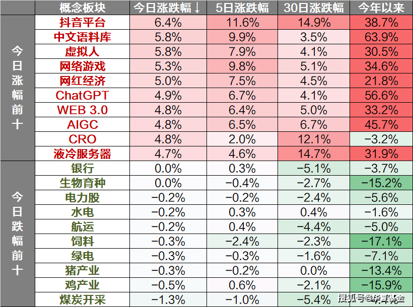 概念主题方面,抖音平台、中文语料库、虚拟人等板块上涨,煤炭开采、鸡产业、猪产业等板块下跌。