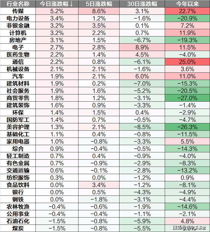 行业上来看,传媒、电力设备、非银金融等板块领涨,煤炭、石油石化、公用事业等板块下跌。