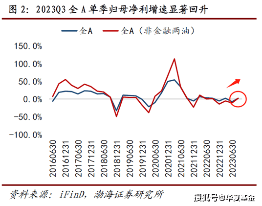2023年三季度,全A以及全A(非金融两油)单季度归母净利增速分别为1.5%、2.1%,较二季度大幅回升9.5和13.9个百分点,迎来上行拐点。