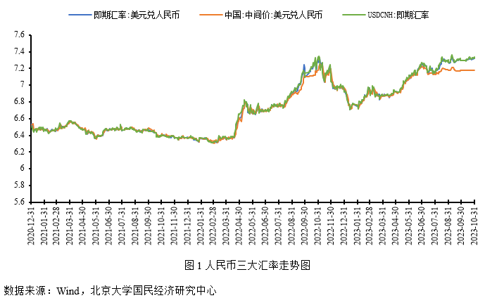 2023年10月,受到中美利差倒挂、美元指数走强、货币政策分化等因素影响,人民币汇率呈现出震荡下跌趋势,总体呈现在7.1775至7.3426区间内双向波动。其中,人民币在岸汇率从7.3002跌至7.3176,累计下跌174个基点;人民币中间价从7.1798调升至7.1779,累计调升19个基点;人民币离岸汇率从7.2957跌至7.3426,累计下跌469个基点。主要原因包括:第一,10月刚公布的一系列美国经济数据表现强劲,9月美国非农新增就业人数为33.6万人,远高于预期的17万人;10月美国Markit制造业PMI初值为50.0,高于预期49.5及前值49.8;9月美国零售数据季调环比增长0.7%,远超预期0.3%。第二,美联储货币政策方向。9月美国核心CPI同比增长4.1%,核心PCE同比增长3.7%,均低于前值;国际原油价格震荡下行,10月布伦特原油现货价格平均值为91.21美元/桶,较9月环比下降3.2%。核心通胀及原油价格下行,市场预期11月美联储或暂停加息。第三,10月公布三季度国内经济数据好于预期,整体经济出现企稳迹象,未来有望进一步改善。