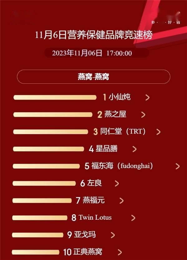 京东健康11.11期间,作为年轻消费者最青睐的中式滋补品之一,燕窝品类销量迎来了爆发式增长。据11月6日营养保健品牌竞速榜17时数据显示,燕窝品类下各大品牌竞争激烈,小仙炖品牌凭借更高成交额暂时领跑榜单,燕之屋、同仁堂(TRT)紧随其后,蓄势待发。星品膳、福东海(fudonghai)、左良、燕福元、亚戈玛、正典燕窝、Twin Lotus等品牌入围榜单前十。