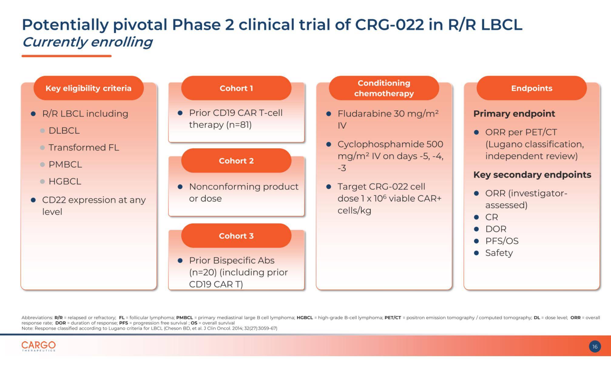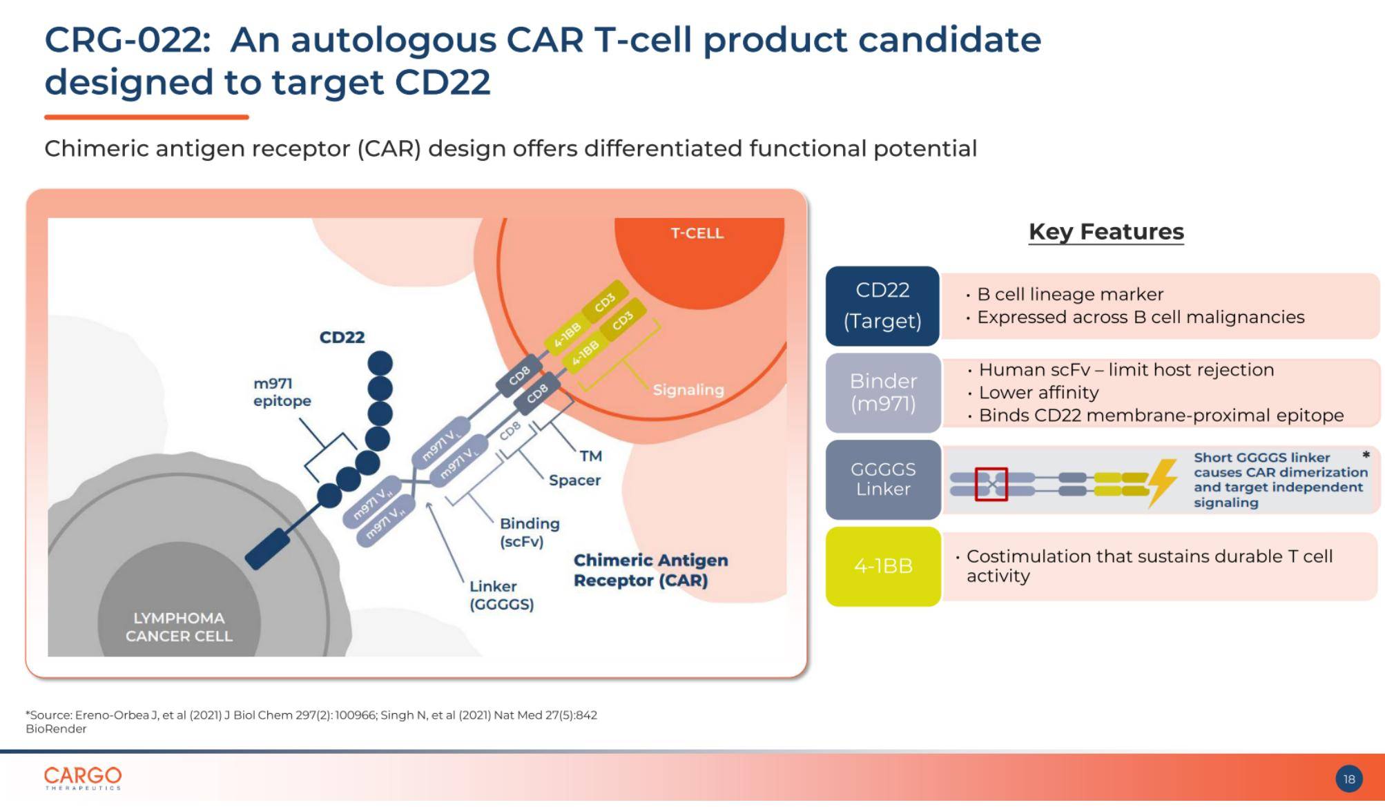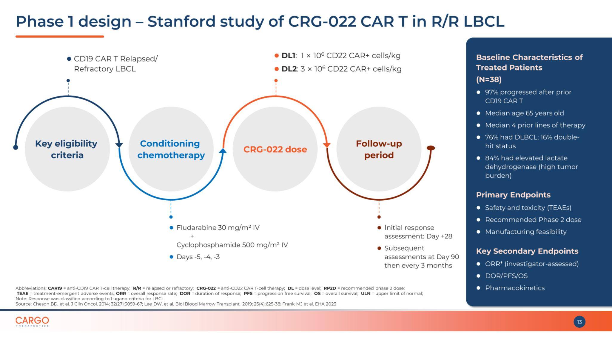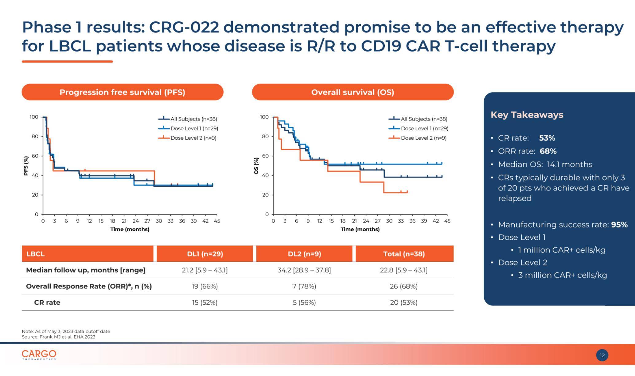 CRG-022为CARGO Therapeutics目前主要候选药物,利用表达CD22靶向CAR的慢病毒载体(m971-BBZ)进一步转导到自体T细胞而构成。目前CRG-022正进行I期临床试验,中期结果显示,对38例CD19 CAR-T细胞治疗后复发/难治性大B细胞淋巴瘤(R/R LBCL)患者,CR与ORR分别达到53%和68%。
