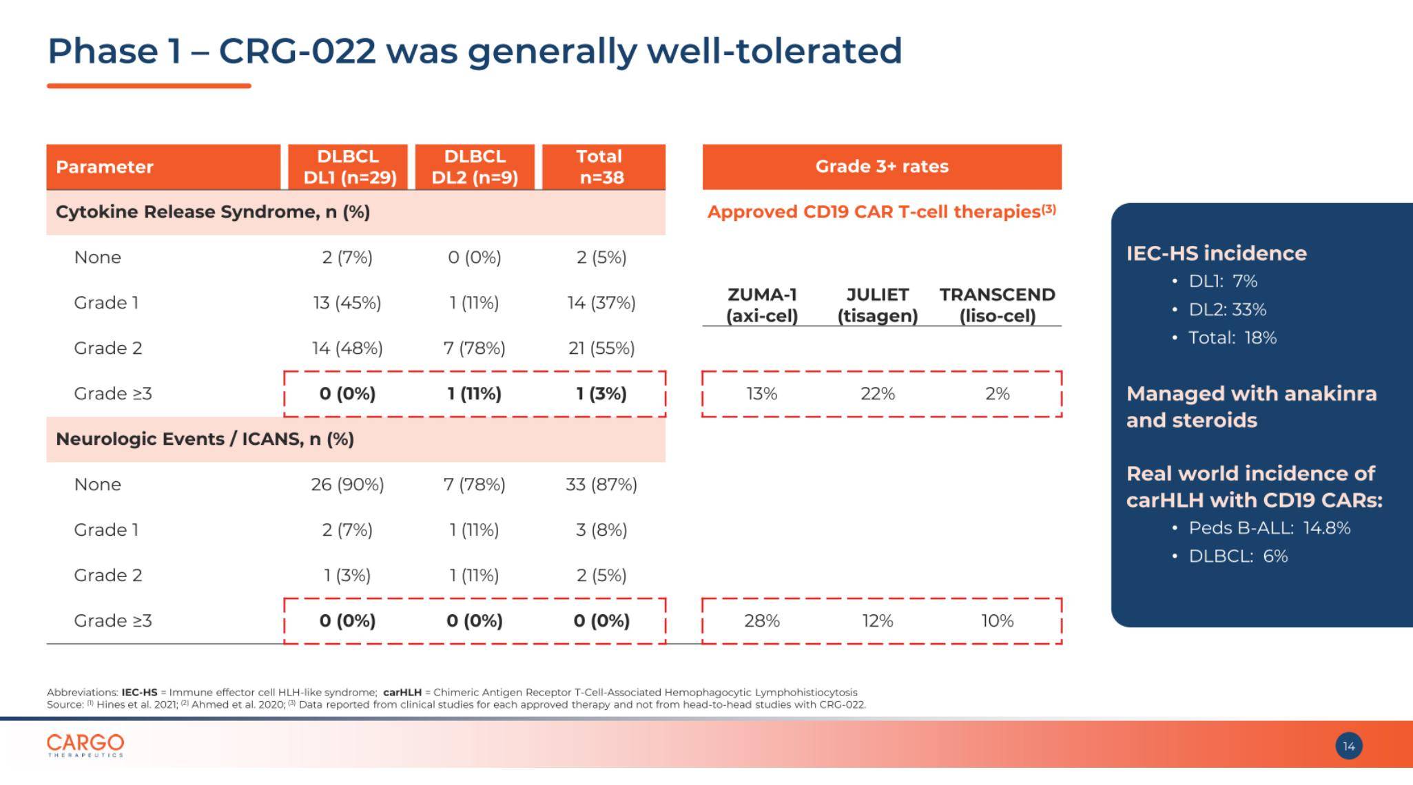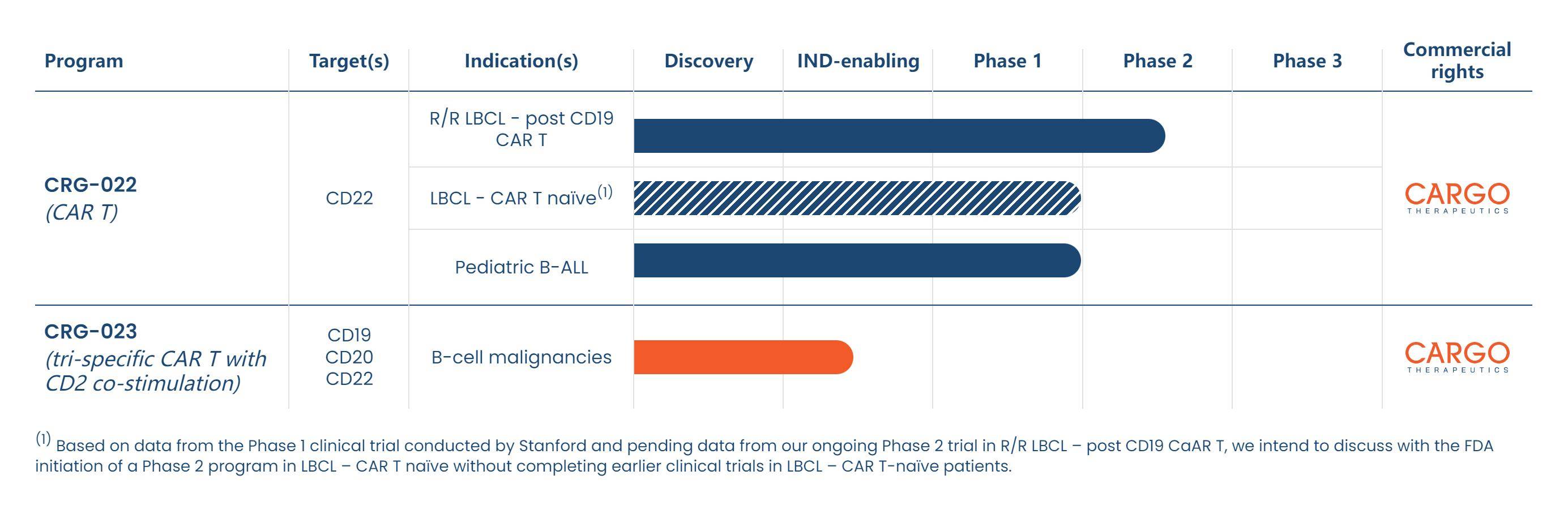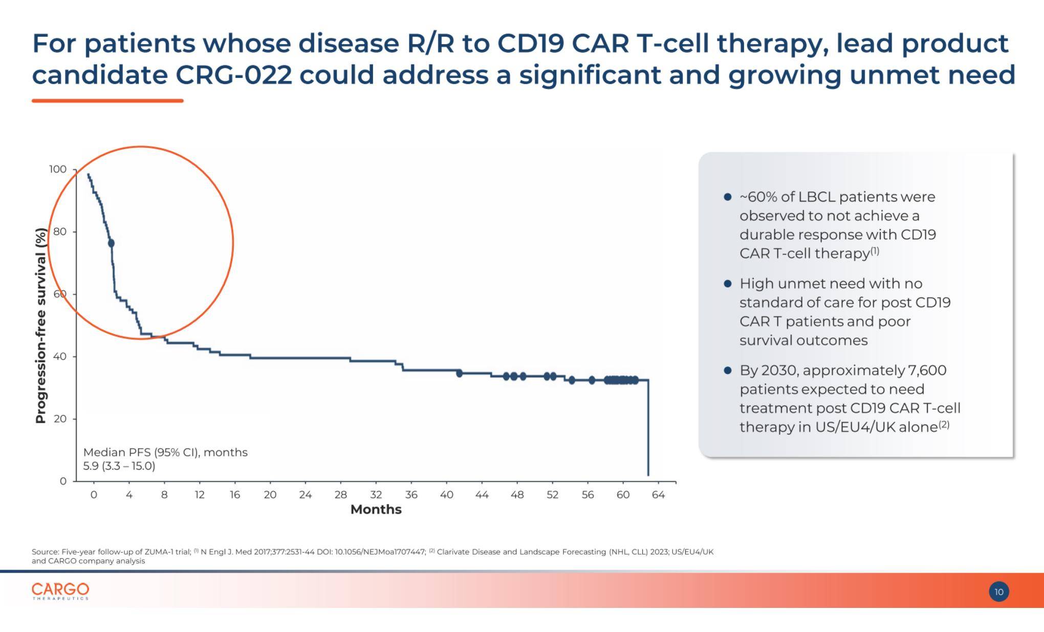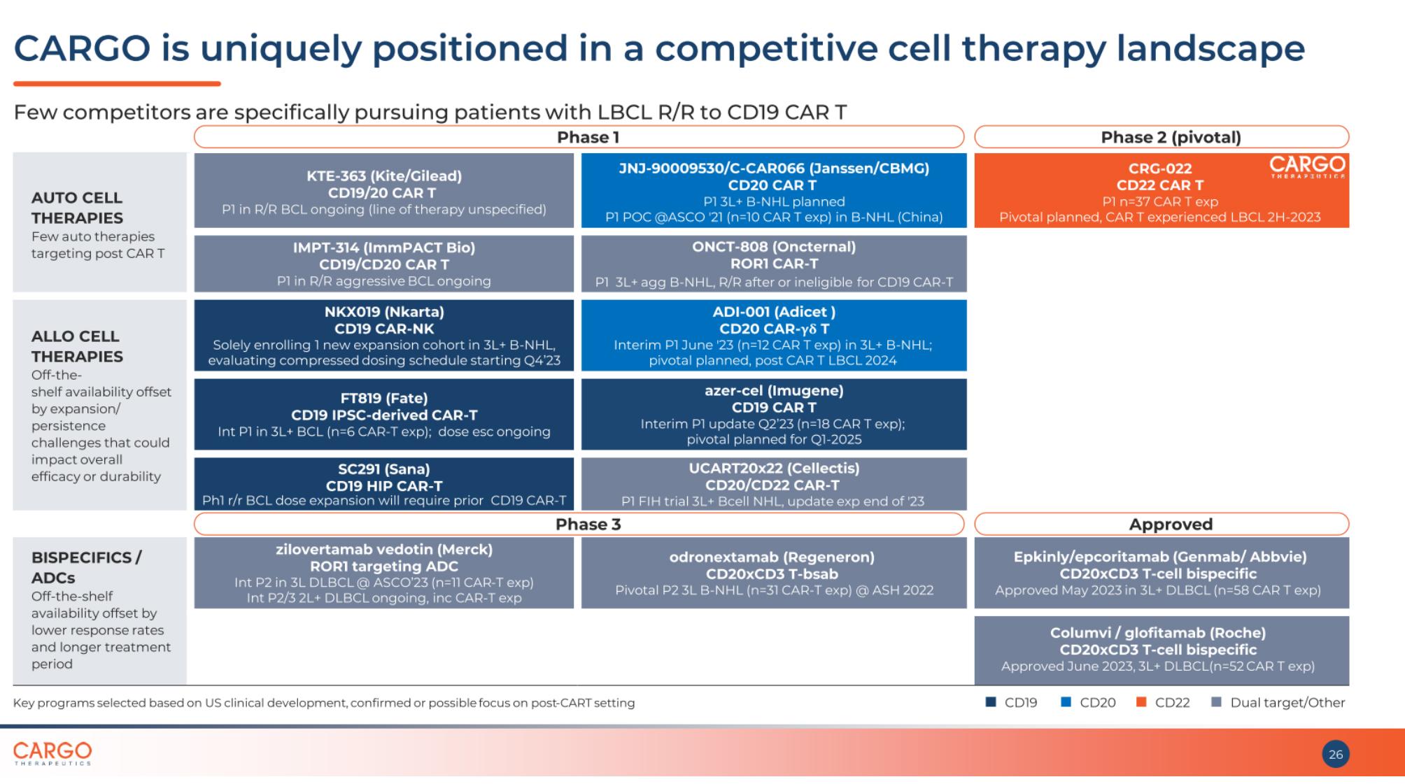 CRG-022为CARGO Therapeutics目前主要候选药物,利用表达CD22靶向CAR的慢病毒载体(m971-BBZ)进一步转导到自体T细胞而构成。目前CRG-022正进行I期临床试验,中期结果显示,对38例CD19 CAR-T细胞治疗后复发/难治性大B细胞淋巴瘤(R/R LBCL)患者,CR与ORR分别达到53%和68%。