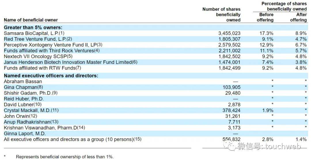 IPO前,Samsara BioCapital, L.P.持股为17.3%,Red Tree Venture Fund, L.P.持股为9.1%,Perceptive Xontogeny Venture Fund II, LP持股12.9%,Funds affiliated with Third Rock Ventures持股11.1%;