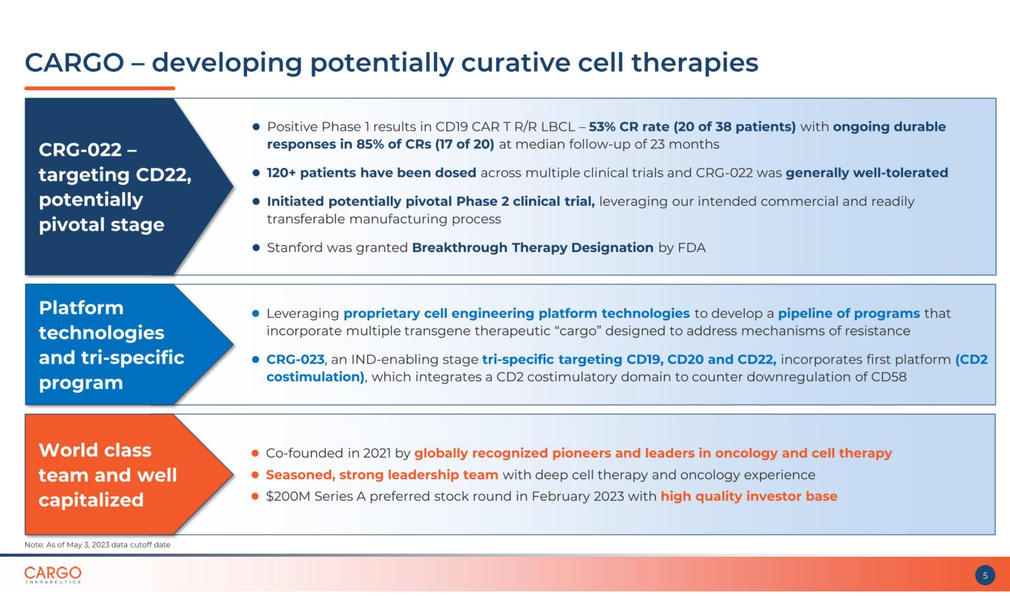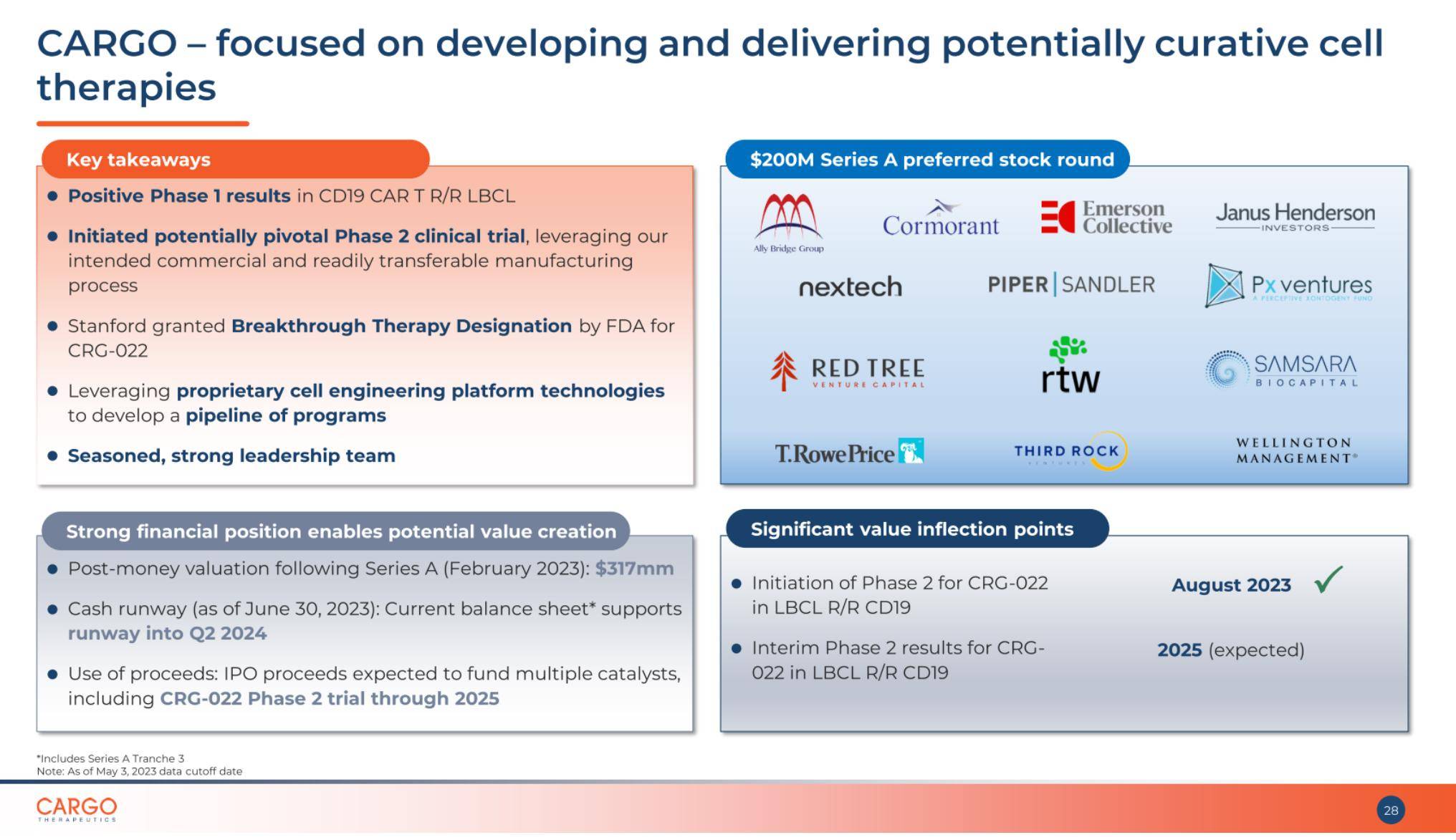 2023年3月,CARGO Therapeutics刚获2亿美元的A轮融资,投资方包括Third Rock Ventures、汇桥资本等机构,融资金额将用于自体CD22 CAR-T疗法CRG-022的多中心II期临床实验。