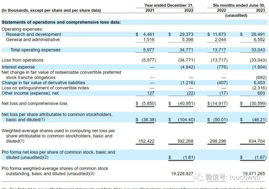 CARGO Therapeutics在2023年上半年运营亏损为3304万美元,上年同期的运营亏损为1372万美元;净亏损为3060万美元,上年同期的净亏损为1492万美元。