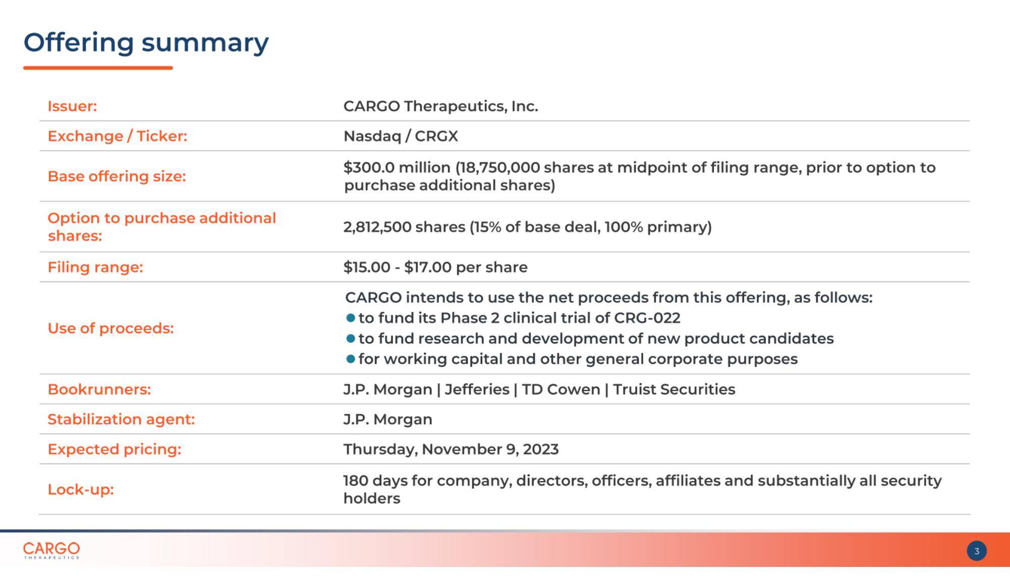 CARGO Therapeutics发行区间为15美元到17美元,发行1875万股,最高募资3.19亿美元。