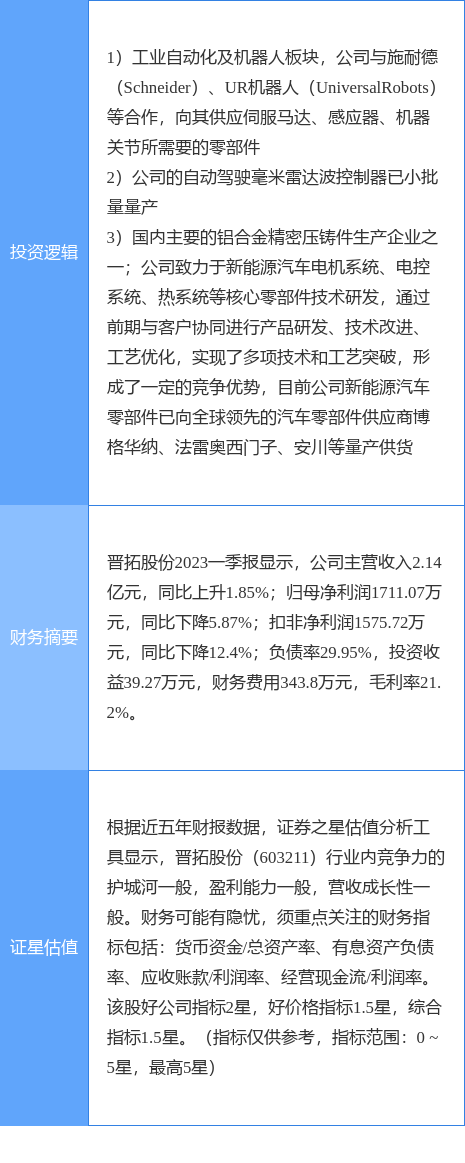 晋拓股份涨停收盘,收盘价17.01元。该股于9点40分涨停,1次打开涨停,截止收盘封单资金为3890.77万元,占其流通市值3.37%。