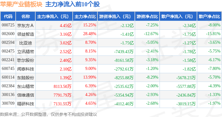 从资金流向上来看,当日苹果产业链板块主力资金净流入22.45亿元,游资资金净流出12.77亿元,散户资金净流出9.68亿元。苹果产业链板块个股资金流向见下表: