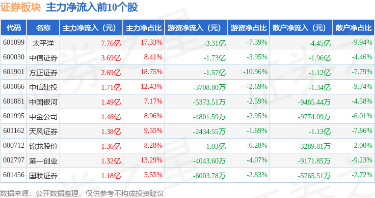 从资金流向上来看,当日证券板块主力资金净流入40.34亿元,游资资金净流出16.27亿元,散户资金净流出24.07亿元。证券板块个股资金流向见下表:
