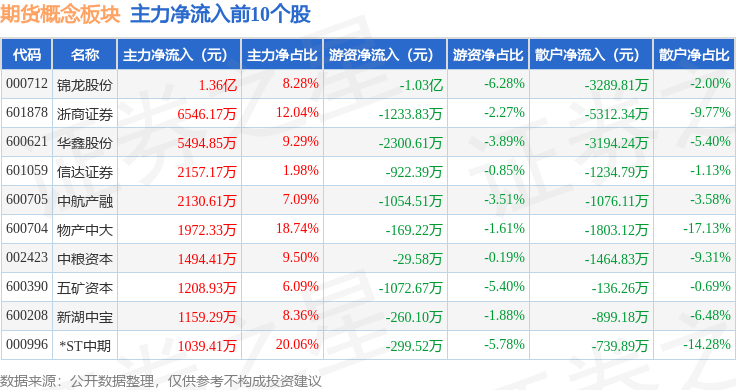 从资金流向上来看,当日期货概念板块主力资金净流入2.74亿元,游资资金净流出7200.42万元,散户资金净流出2.02亿元。期货概念板块个股资金流向见下表: