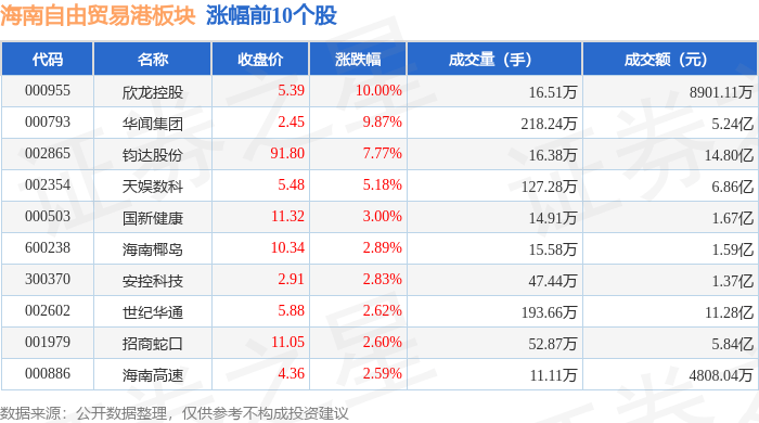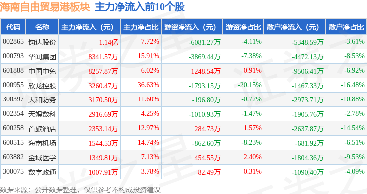 从资金流向上来看,当日海南自由贸易港板块主力资金净流入2.49亿元,游资资金净流出4810.03万元,散户资金净流出2.01亿元。海南自由贸易港板块个股资金流向见下表: