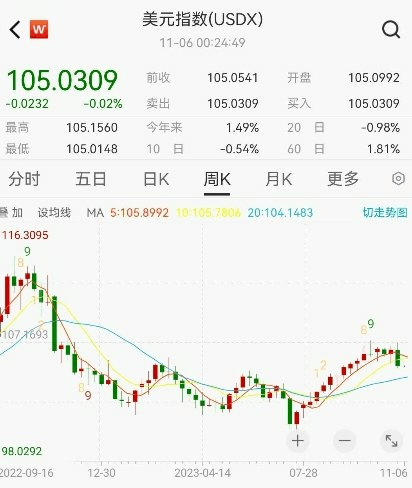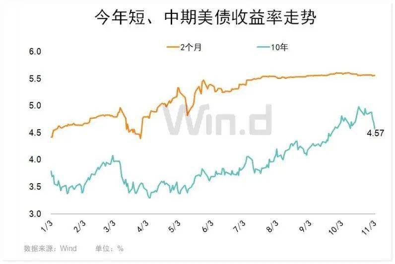 随着美联储连续暂停加息落地,短、中期 美债收益率 有所回落。Wind数据显示,从短期2个月 美债收益率 走势来看,今年整体震荡上升趋势明显。年初自4.42%逐渐上升到9月底高点5.61%,随后小幅回落至最新5.56%,回落幅度较小。而中期 10年期美债收益率 近期则大幅回调,已经由10月下旬高位4.98%回落到目前4.57%,下跌速度较快,与短期现成明显差异。可见一旦美联储加息停止或预期缓和, 美债收益率 也有望稳步回落。 美元指数 或逐渐走弱。