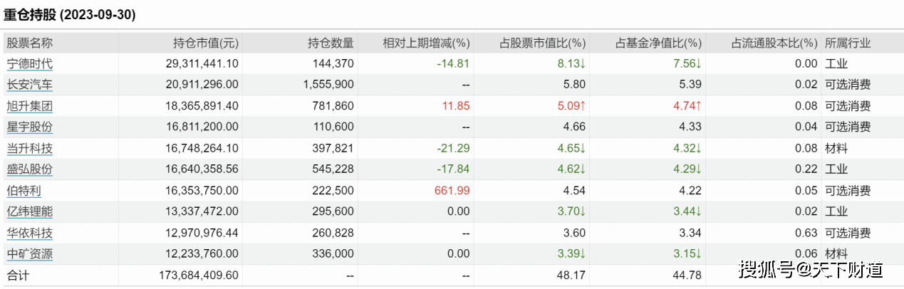 截至三季度末,该基金的重仓股仍以新能源车、锂电池相关个股为主。有点悲催的是,第一大重仓股宁德时代,9月份以来跌幅达20%;第三大重仓股旭升集团则在10月份连续跳水。