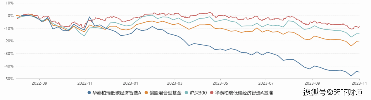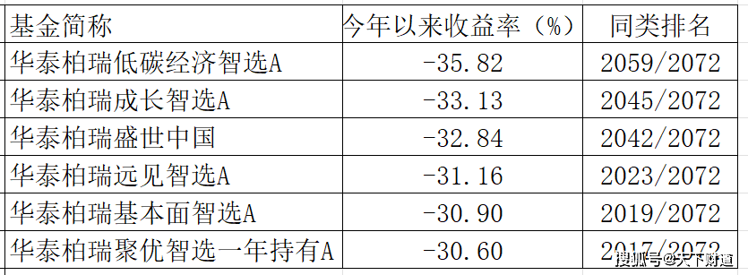 首当其冲的是华泰柏瑞低碳经济智选A,以35.82%的年内跌幅在该公司产品中表现最差,同类排名2059/2072。大幅落后于业绩基准、沪深300指数和偏股混合基金均值。