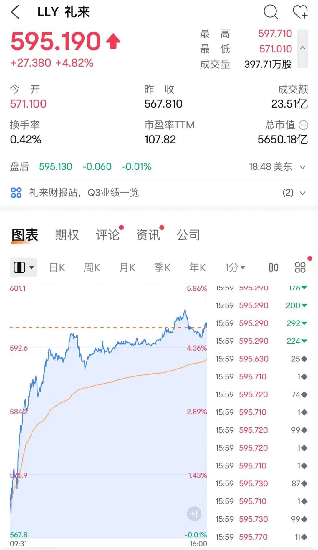 截至收盘,礼来涨4.82%,报595.19美元/股,最新总市值5650.18亿美元,为全球目前市值最高药企。