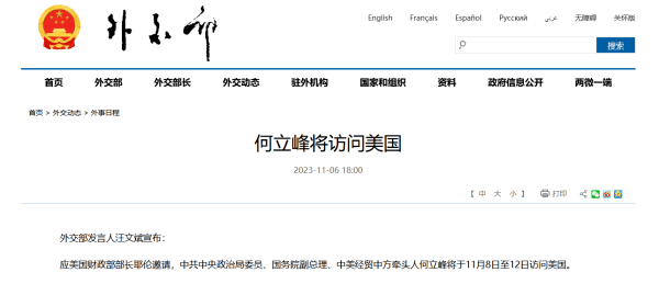 应美国财政部部长耶伦邀请,中共中央政治局委员、国务院副总理、中美经贸中方牵头人何立峰将于11月8日至12日访问美国。