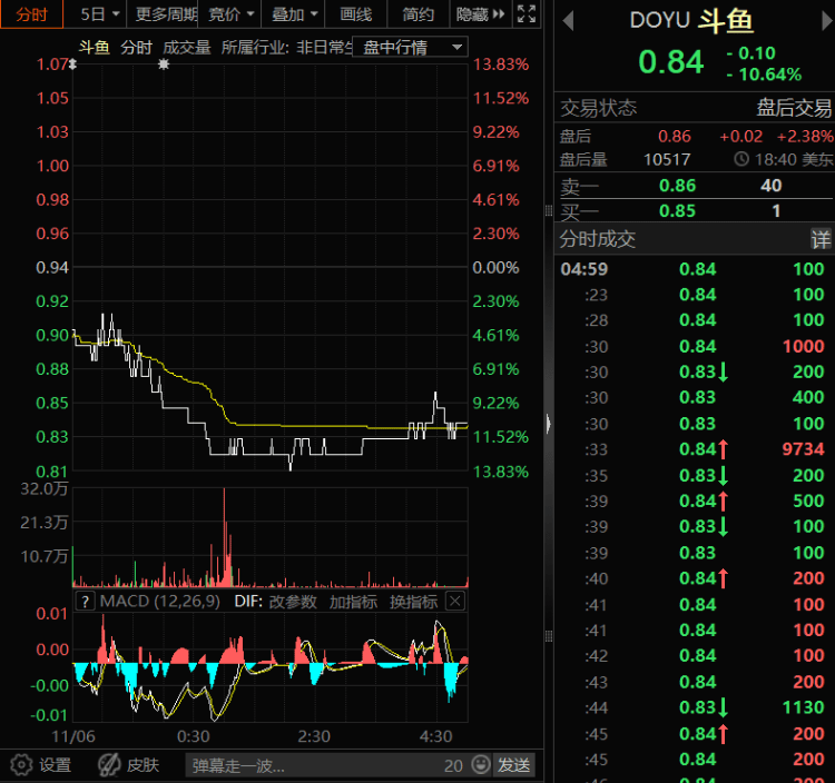 北京时间11月7日消息,在CEO失联疑似失联消息影响下,隔夜,中概股斗鱼股价暴跌,盘中最低跌13.35%,一度触及0.81美元,股价创历史新低,截至收盘,斗鱼的股价跌10.04%,报0.84美元,市值2.686亿美元。