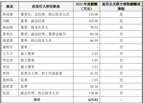 更值得注意的是,在经营现金流持续为负且用6亿元募集资金补充流动资金的同时,该公司的高管们拿着高额薪酬。2022年,该公司的董事长、总经理林佳继的薪酬为110万元,其董事、副总经理刘群的薪酬为102.9万元;所有高管的年薪合计625.82万元。