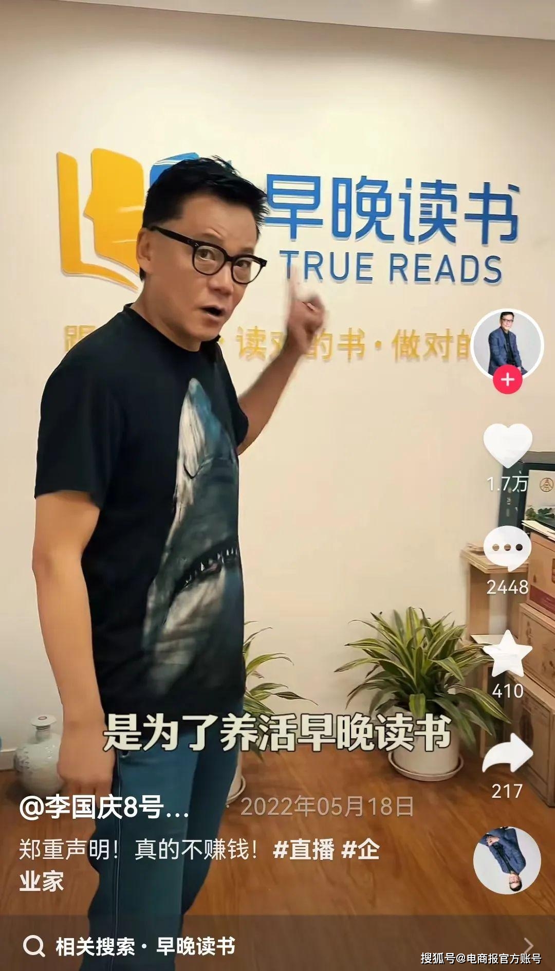 2022年5月,李国庆在抖音发布视频称,自己直播卖酒,是为了赚钱养活早晚读书。他自嘲早晚读书办公室“太寒酸了”,但又表示“这里装着我的初心和梦想”。