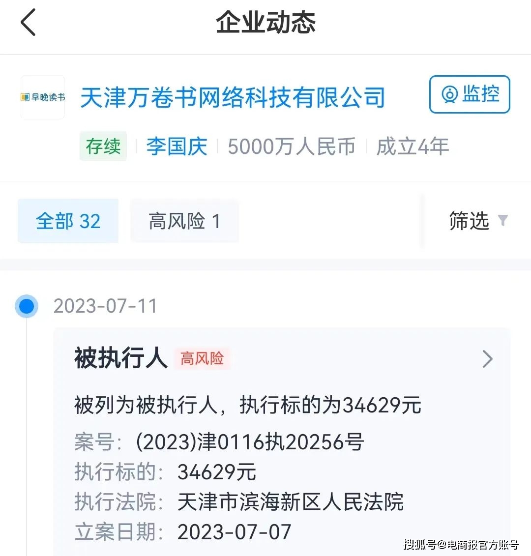 今年7月,“早晚读书”项目的主体公司天津万卷书网络科技有限公司(简称“天津万卷书”)成被执行人,执行标的3.46万元,执行法院为天津市滨海新区人民法院。