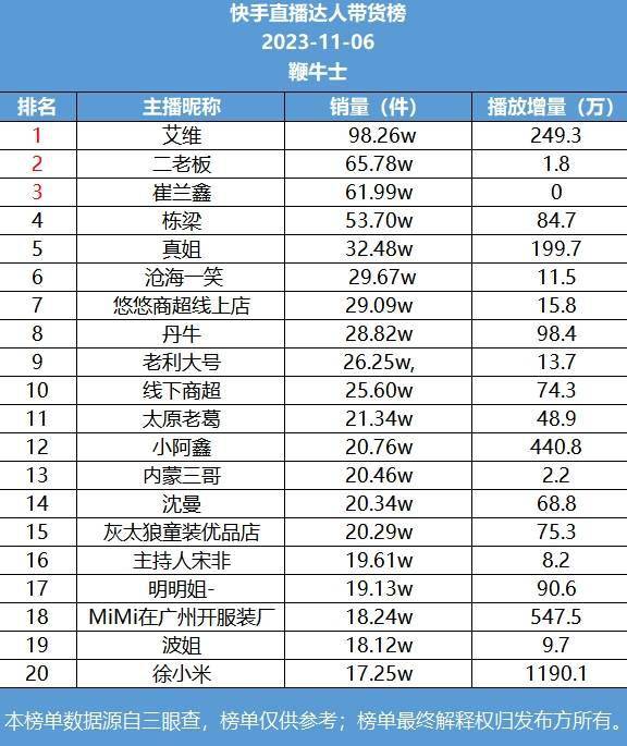快手榜一是艾维,销量98.26万件;榜二是二老板,销量65.78万件;榜三崔兰鑫,销量61.99万件。