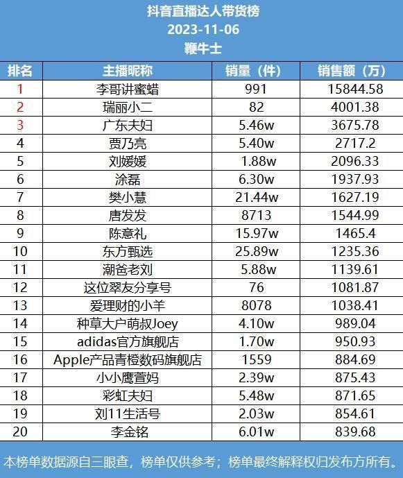 11月6日,抖音直播达人带货榜一是李哥讲蜜蜡,销售额15844.58万;榜二瑞丽小二,销售额4001.38万;榜三广东夫妇,销售额3675.78万。