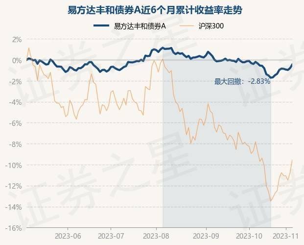 证券之星消息,11月6日,易方达丰和债券A最新单位净值为1.3203元,累计净值为1.4293元,较前一交易日上涨0.33%。历史数据显示该基金近1个月下跌0.32%,近3个月下跌1.57%,近6个月下跌0.44%,近1年上涨0.52%。该基金近6个月的累计收益率走势如下图: