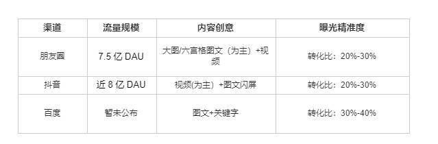 目前企业数字化营销获取公域流量核心渠道主要有:朋友圈、抖音、百度,3种渠道从流量到投流策略上各不相同,其中,朋友圈和抖音主要是以信息流广告为主向,自身流量规模较大并且投流智能化程度比较高所以相对容易出效果。