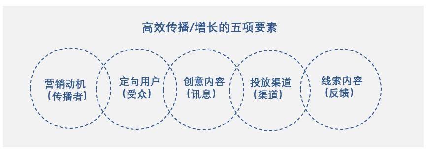 公域渠道流量的获取关键在于信息的传播效率,如何将高价值的消息传播给最广泛,最合适的人群是实现公域流量投放高增长的关键,在传统的传播学当中能够实现高效的传播需要五项基本要素:传播者、受众、讯息、媒介、反馈。