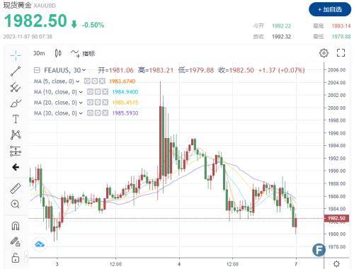 截至发发稿,现货黄金向下触及1980,现报1982.50美元/盎司,日内跌0.50%。