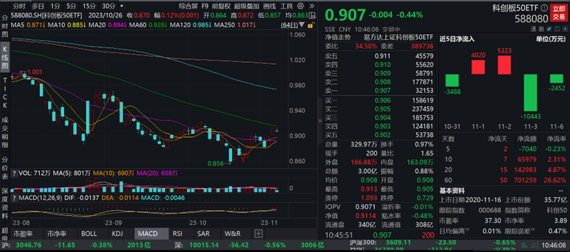 截至2023年11月7日10:46,科创板50ETF(588080)盘中震荡回调0.44%,成交额达3亿元,成交额持续扩大,委比超30%,买盘活跃、资金布局意愿强烈。