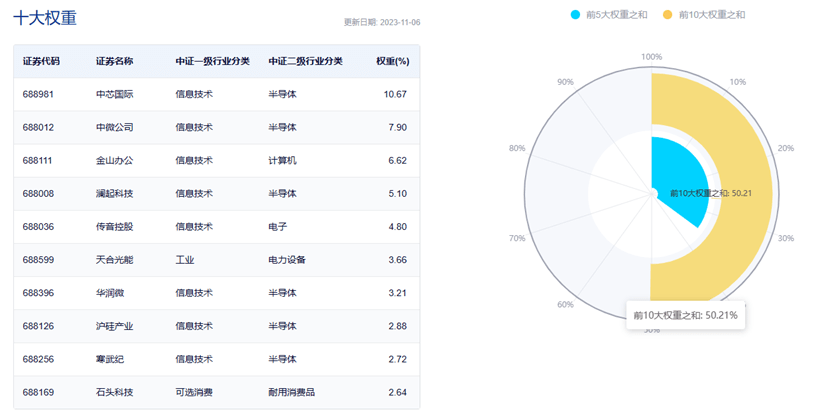 截至2023年11月6日,该指数前十大权重股包括中芯国际、中微公司、金山办公、澜起科技、传音控股等,前十大权重股占比合计约为50.21%。(数据来源:中证指数公司,指数成份股不代表个股推荐)