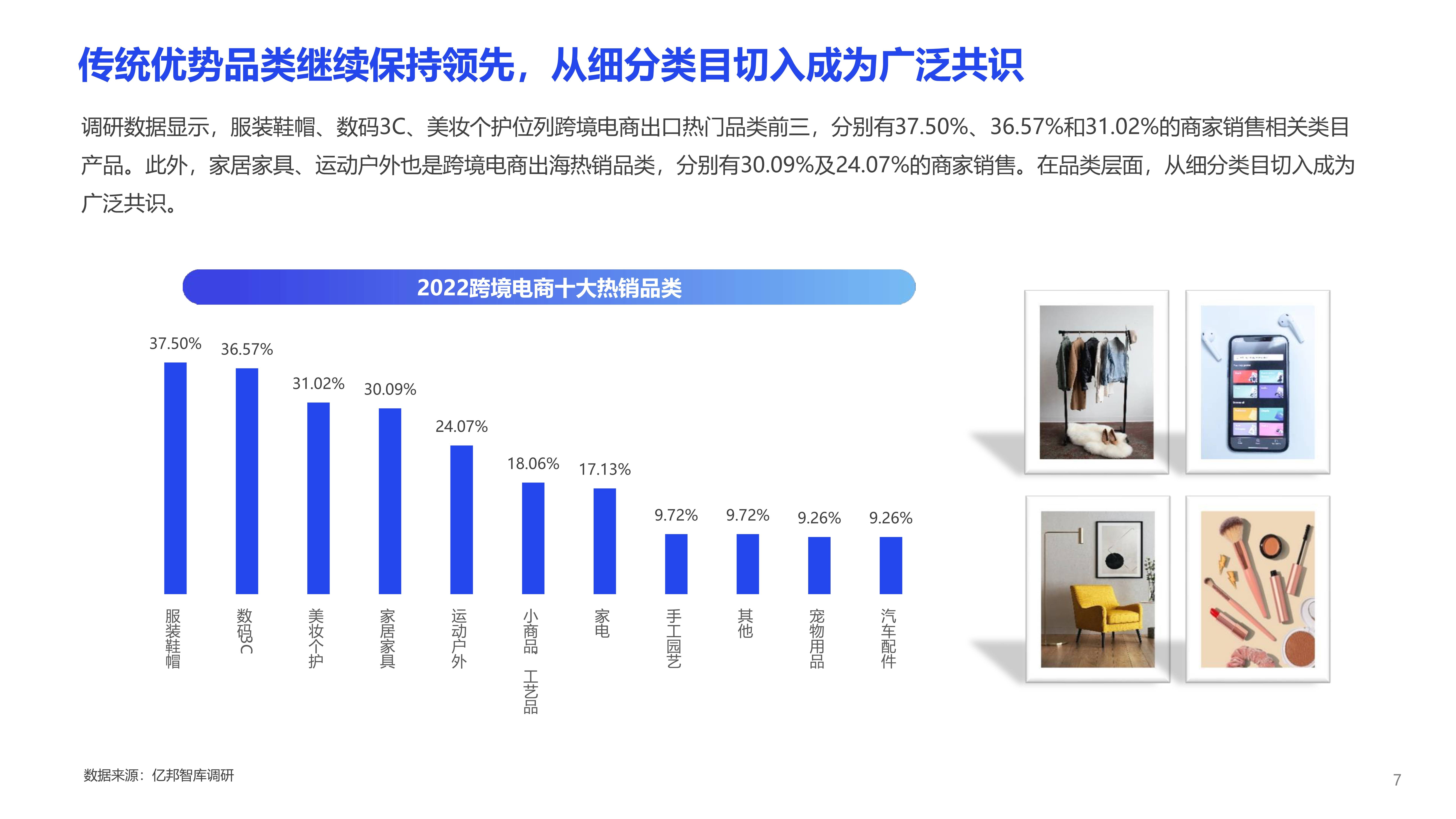 中国跨境电商产业带各有特色,在政策红利不断释放下,诸多传统外贸产业带通过跨境电商实现了全球业务拓展和品牌打造。同时,部分跨境电商产业带从沿海发达地区向中西部内陆地区转移,呈现多点开花的全新格局。调研数据显示,服装鞋帽、数码3C、美妆个护位列跨境电商出口热门品类前三,分别有37.50%、36.57%和31.02%的商家销售相关类目产品。此外,家居家具、运动户外也是跨境电商出海热销品类,分别有30.09%及24.07%的商家销售。在品类层面,从细分类目切入成为广泛共识。