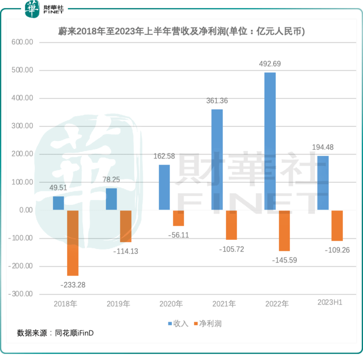从公司成绩单来看,蔚来可以说是流着血负重跑马拉松。尽管近几年来未来收入增长迅猛,但蔚来一直处于亏损旋涡中。根据同花顺iFinD数据统计,2018年至今年上半年,蔚来累计亏损额达764亿元(单位:人民币,下同),为造车新势力中的亏损之王。而在同期,理想、小鹏和零跑(09863.HK)累计亏损额分别约为50亿元、309亿元及122亿元,合计没有蔚来亏的多。