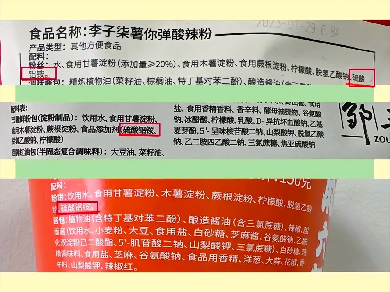 麻六记的代工厂阿宽食品也频发食品安全问题。在今年中国食品安全报发布的《3.15特别报道|10款热销酸辣粉测评》一文中,阿宽食品代工的麻六记酸辣粉、李子柒酸辣粉均被点名,产品被检测出来不但使用的原料不全是其宣传的纯红薯粉,而且添加了铵明矾。经过添加铵明矾的粉条不仅增加了光泽和弹性,吃起来更筋道,还能实现久煮不烂的效果。