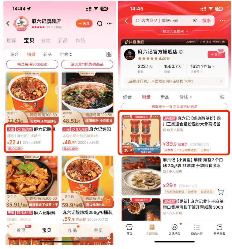 (左:麻六记天猫旗舰店 右:麻六记抖音官方店铺)