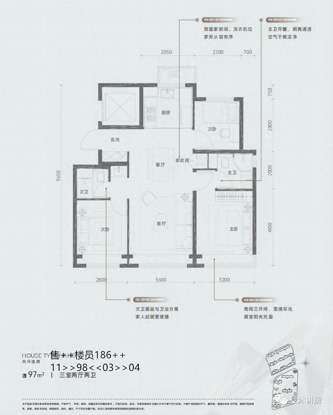 97平三居,共64套房,分布在南侧地块,南向三面宽,南向双卧+客厅设置飘窗,主卧套间设计,厨房U型设计。