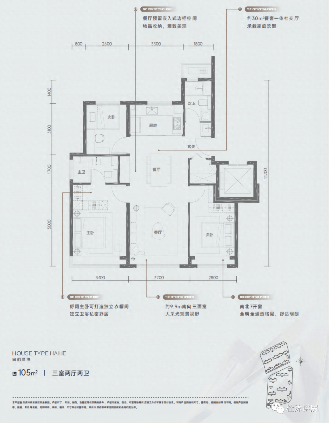105平三居,共96套,也在南区,这个户型也是三面宽,明厨明卫,餐客厨一体,南向主卧设置干湿分离卫生间和飘窗。