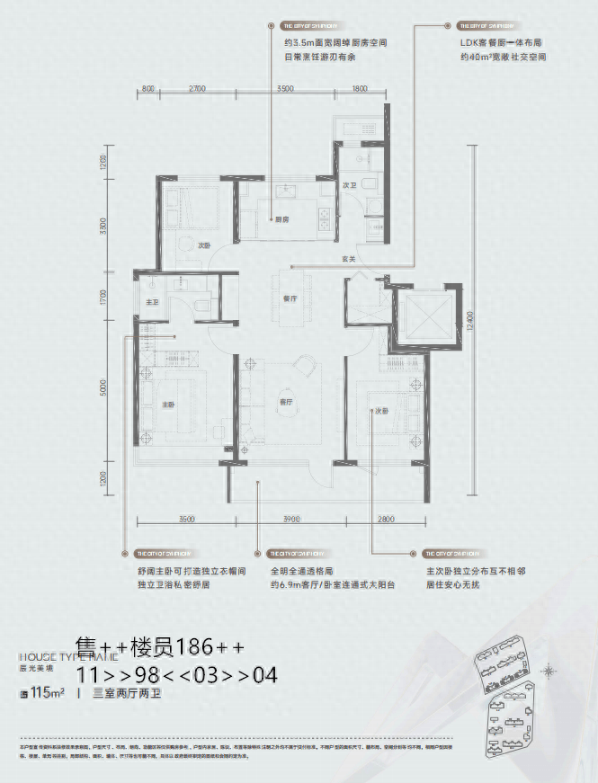 面积区间:97㎡三室两厅一厨两卫,105㎡三室两厅两卫,110㎡三室两厅两卫,115㎡三室两厅两卫,119㎡三室两厅两卫,136㎡四室两厅两卫,160㎡四室两厅两卫,170㎡三室两厅三卫
