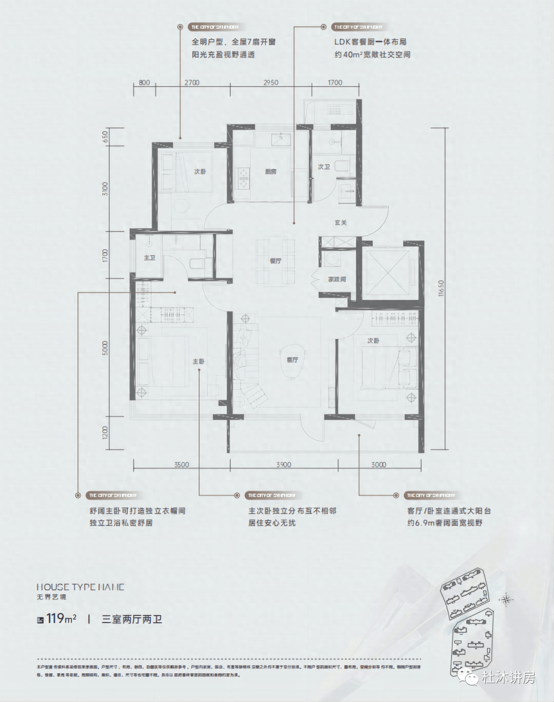 119平三居,这个户型南区和北区都有,还是三面宽,类似于115的放大版,户型全明,南北通透,餐客厨一体,厨房U型设计。