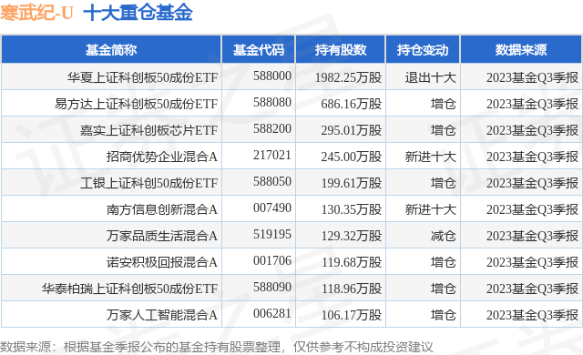 根据2023基金Q3季报公募基金重仓股数据,重仓该股的公募基金共60家,其中持有数量最多的公募基金为华夏上证科创板50成份ETF。华夏上证科创板50成份ETF目前规模为946.73亿元,最新净值0.9349(11月6日),较上一交易日上涨1.79%,近一年下跌16.53%。该公募基金现任基金经理为张弘弢 荣膺。张弘弢在任的基金产品包括:华夏沪深300ETF联接A,管理时间为2009年7月10日至今,期间收益率为29.33%;华夏沪深300ETF,管理时间为2012年12月25日至今,期间收益率为82.04%;华夏网购精选混合A,管理时间为2016年11月2日至今,期间收益率为22.7%;华夏上证50ETF,管理时间为2016年11月18日至今,期间收益率为19.17%。荣膺在任的基金产品包括:华夏中证500ETF联接A,管理时间为2016年10月20日至今,期间收益率为-3.48%;华夏中证500ETF,管理时间为2016年10月20日至今,期间收益率为-3.53%;华夏中证央企ETF,管理时间为2018年10月19日至今,期间收益率为23.58%;华夏创业板价值ETF,管理时间为2019年6月14日至今,期间收益率为34.99%。