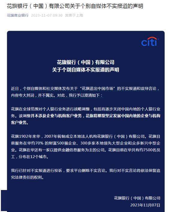 11月7日,花旗银行(中国)有限公司(下称“花旗中国”)发布声明称,近日,个别自媒体和社交媒体发布关于“花旗退出中国市场”的不实报道和误导言论,内容夸大其词,并不属实。